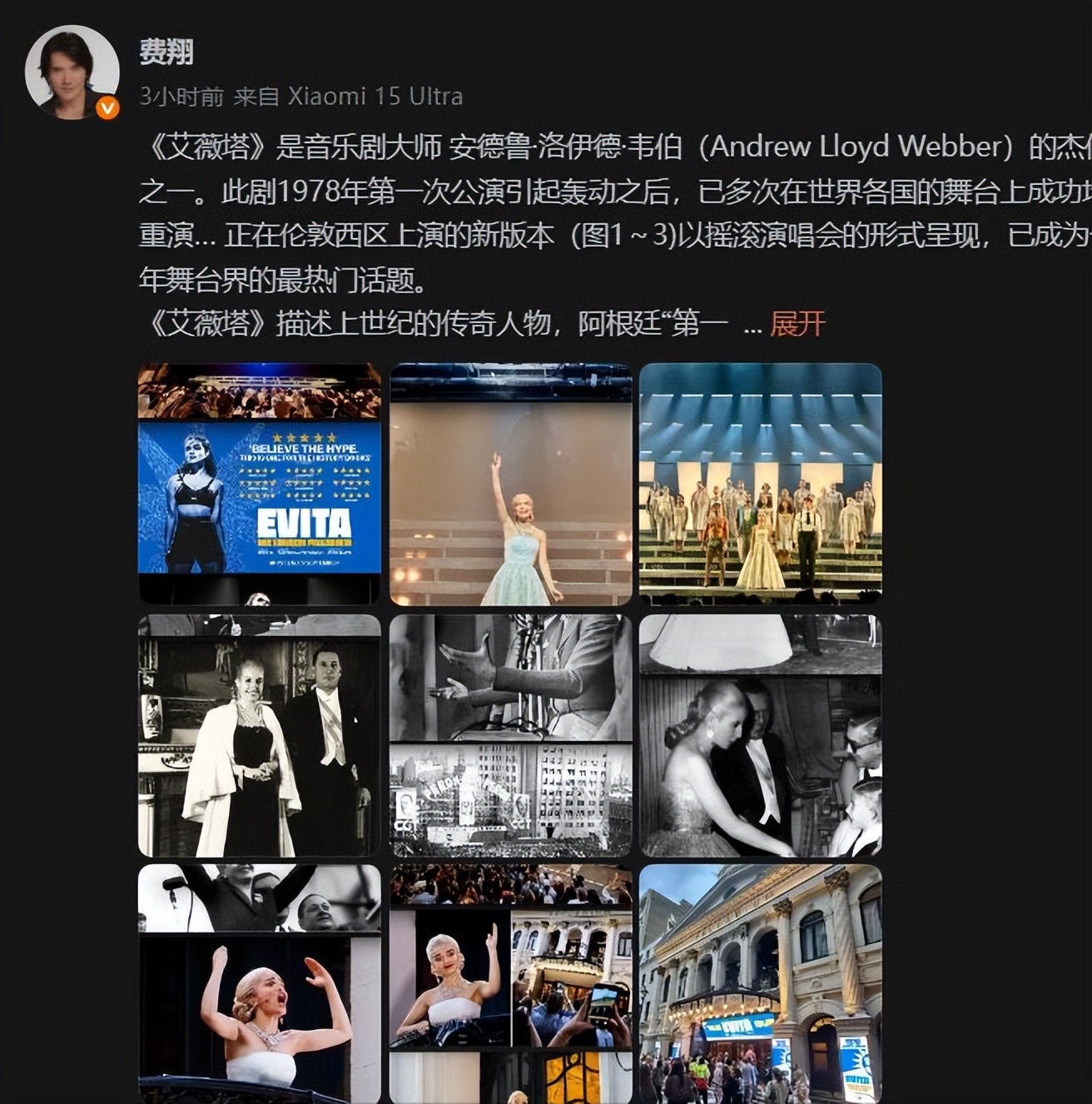 在8月20日,费翔又发了一条动态,《艾薇塔》音乐剧的演出,在音乐的道路上,他一直都在。