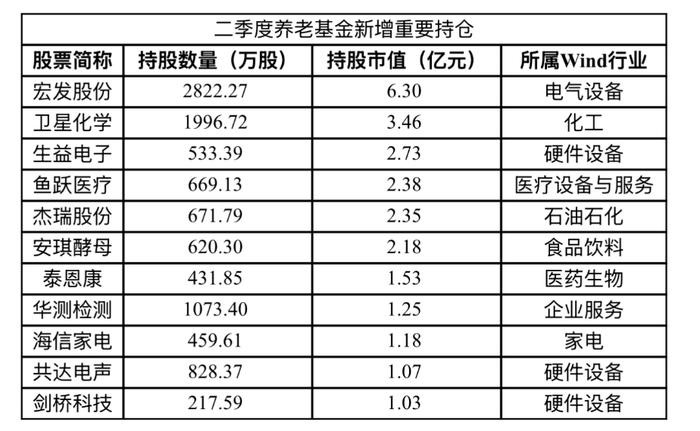 根据二季度末的股价数据计算,养老基金二季度新增持有市值超1亿元的个股有11只,分别为宏发股份、卫星化学、生益电子、鱼跃医疗、杰瑞股份、安琪酵母、泰恩康、华测检测、海信家电、共达电声、剑桥科技。
